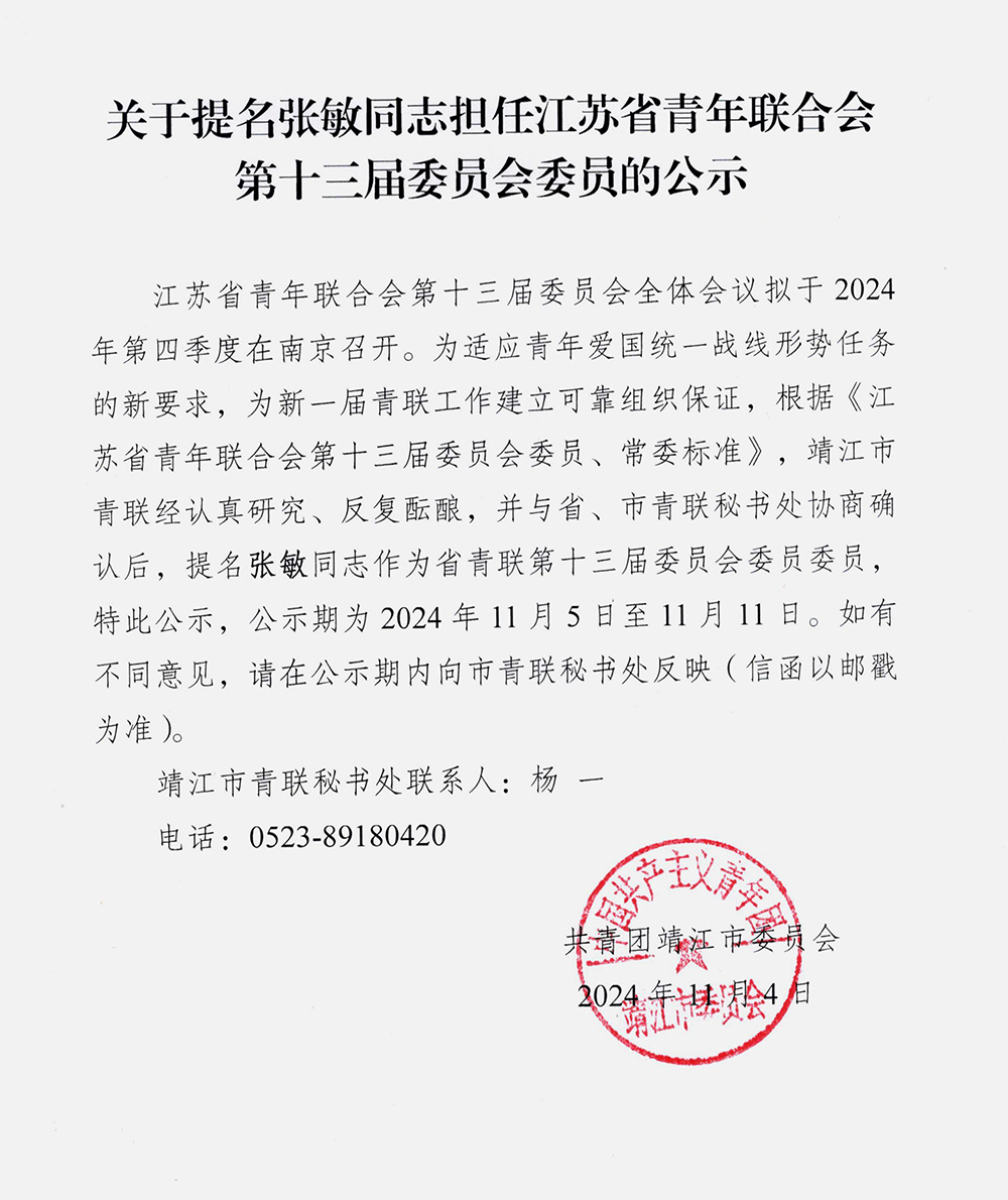 江蘇省青年聯合會第十三屆委員會全體會議擬于2024年第四季度在南京召開。為適應青年愛國統一戰線形勢任務的新要求,為新一屆青聯工作建立可靠組織保證,根據《江蘇省青年聯合會第十三屆委員會委員、常委標準》,靖江市青聯經認真研究、反復醞釀,并與省、市青聯秘書處協商確認后,提名張敏同志作為省青聯第十三屆委員會委員委員,特此公示